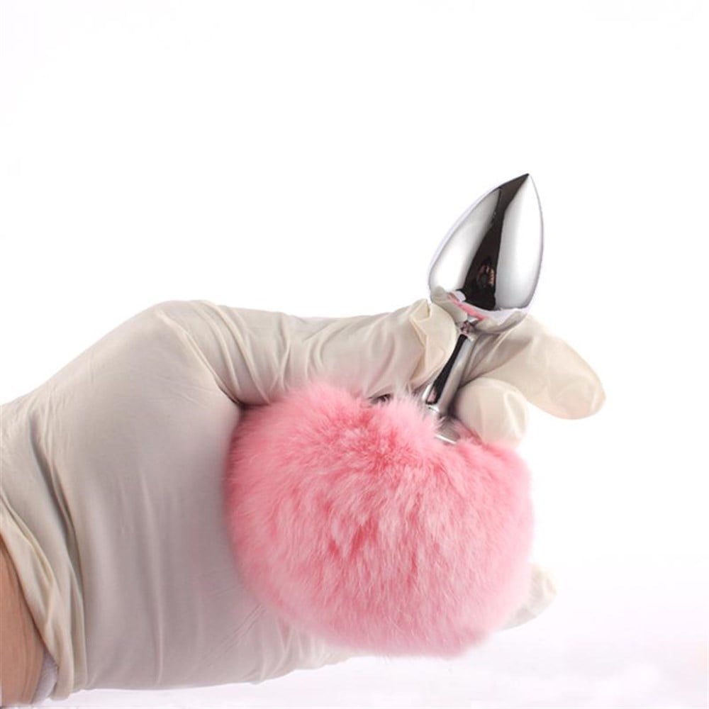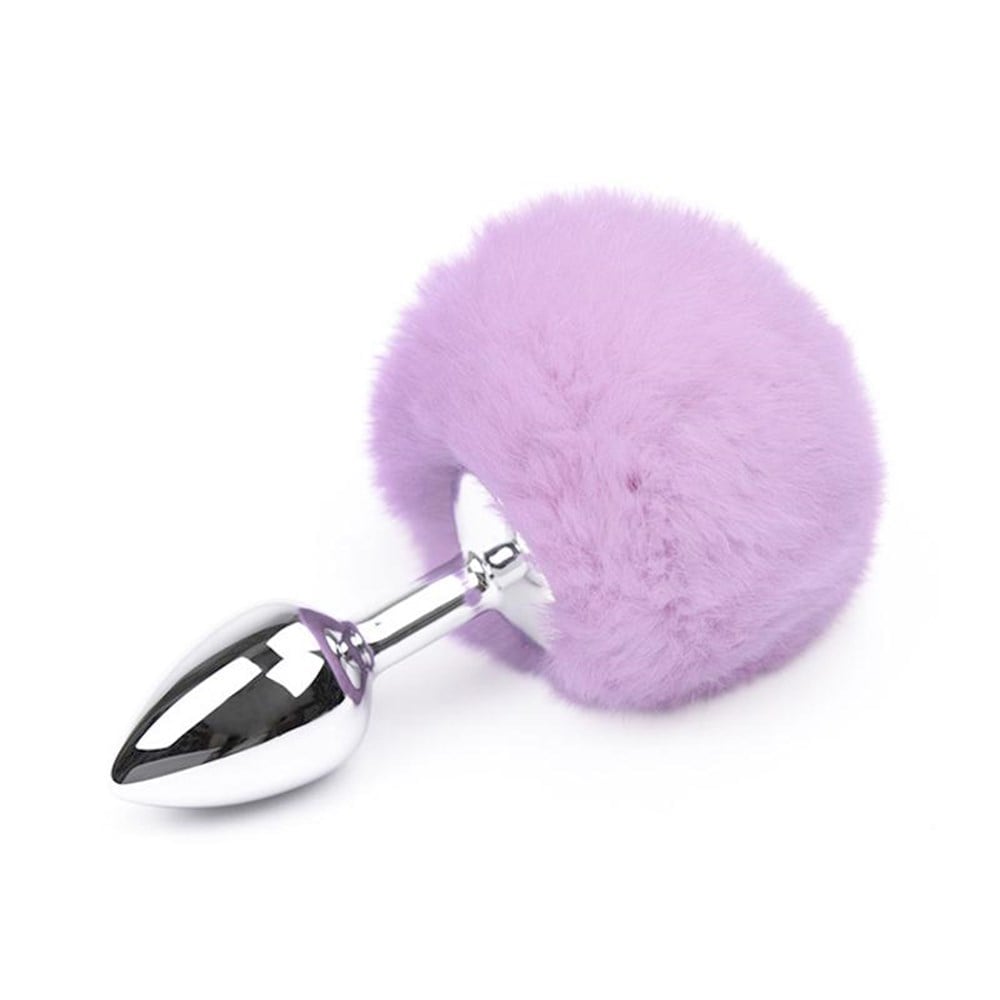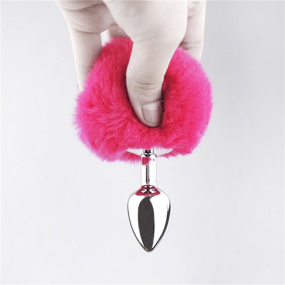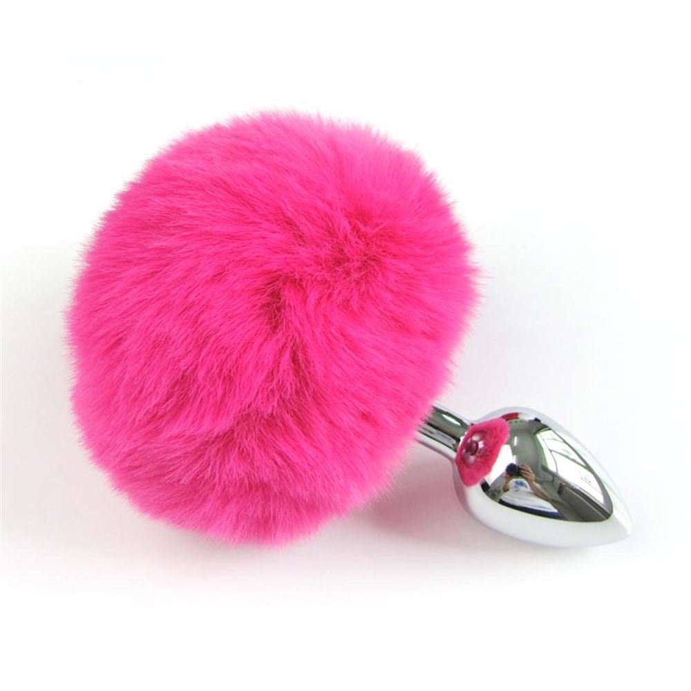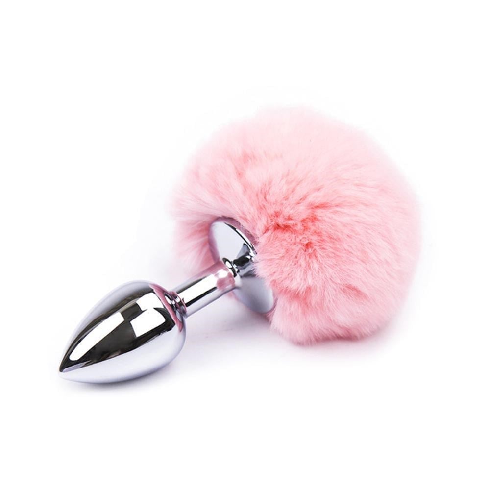 Pürüzsüz ve parlak yüzeye sahip, paslanmaz çelikten yapılmış, arka kısmı tavşan kuyruklu Pembe renkli anal tıkaç plug.